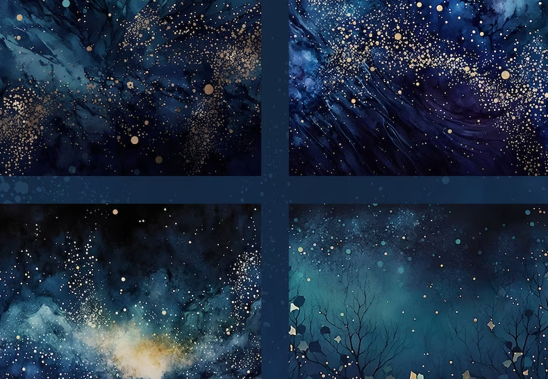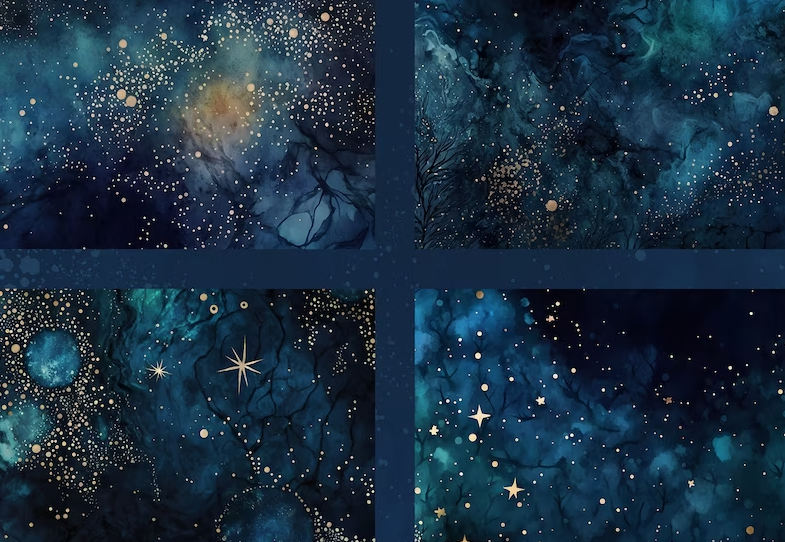 Dive into the mesmerizing depths of the night sky with our "Starry Night Watercolor" digital paper collection. This set, inspired by the beauty of the cosmos, seamlessly combines the rich hues of dark blue with the opulence of gold to create designs that resonate with the grandeur of the galaxy.